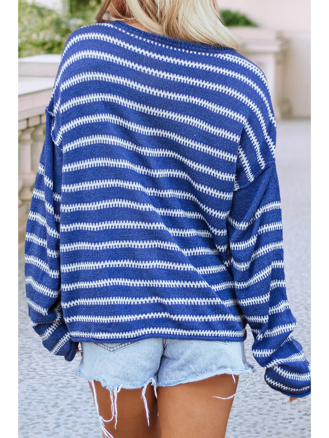 🌊 Step out in style with this blue sweater featuring a white striped pattern.
