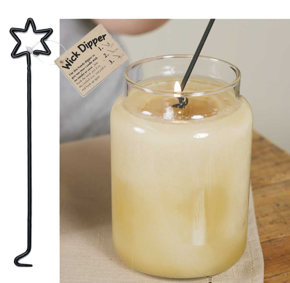 1½" wide and 8" long. These useful Wick Dippers will change the way that you blow out a candle. Use the dipper to hook the wick and extinguish the candle in the wax. The flame goes out with no smoke or soot. The wick is coated in wax and primed for the next lighting. Our Wick Dippers come with an attractive hang tag that explains how to use these items. This is a must-have candle accessory!
